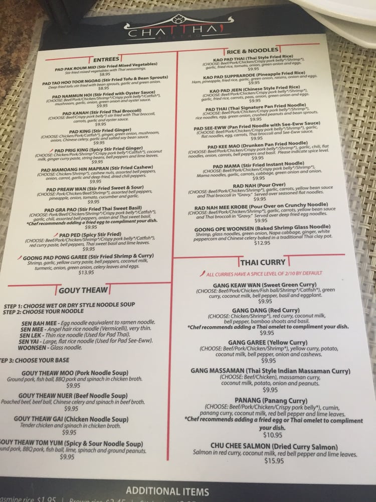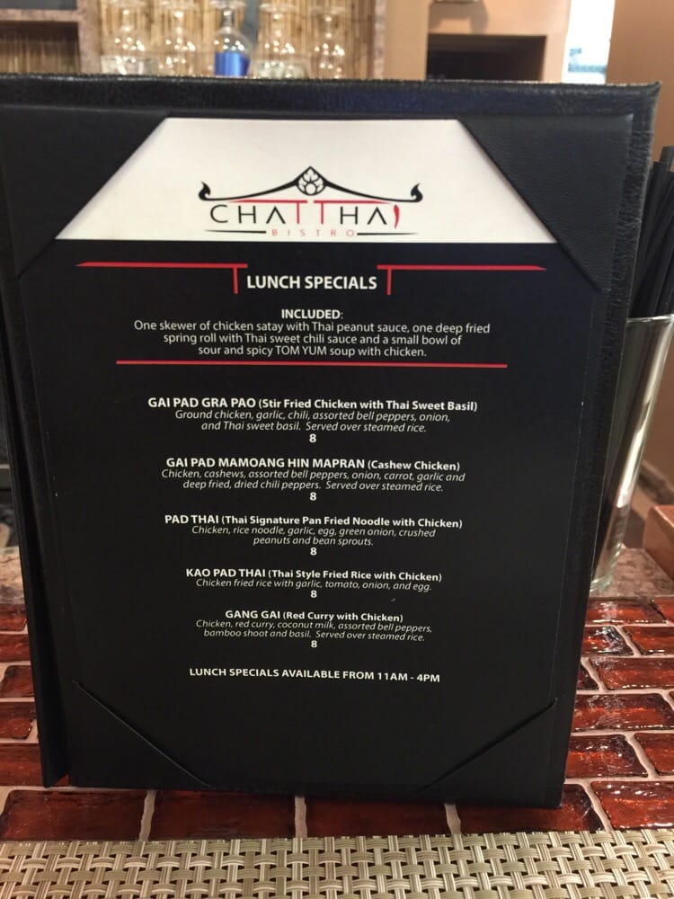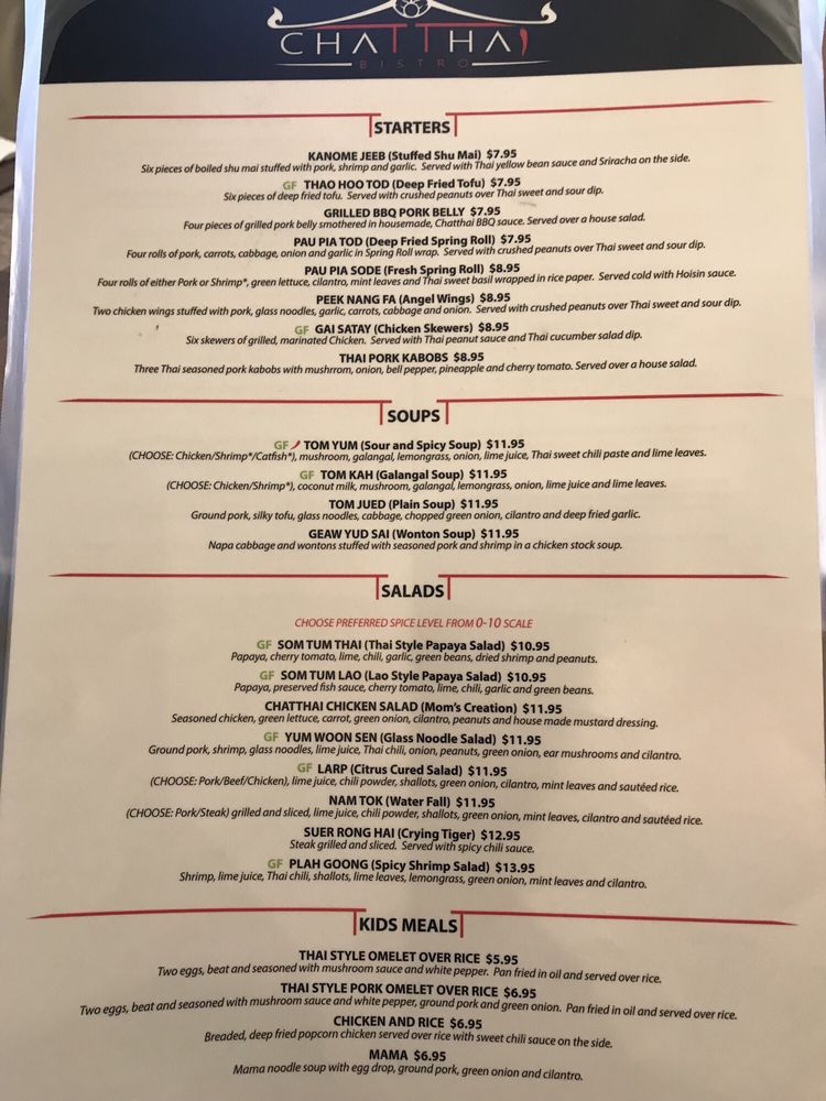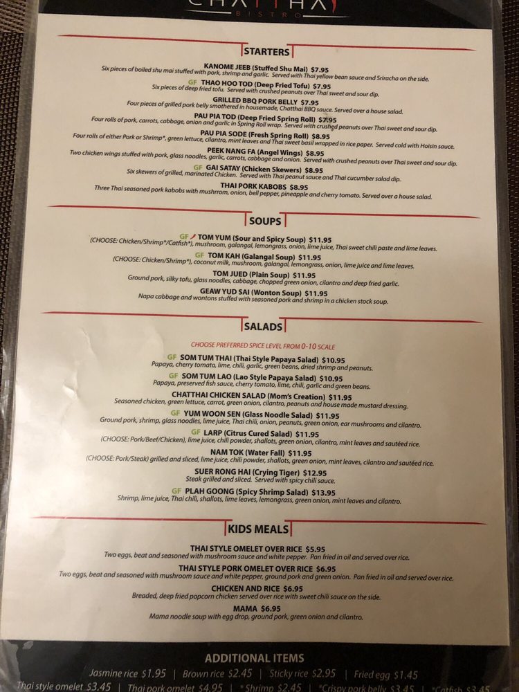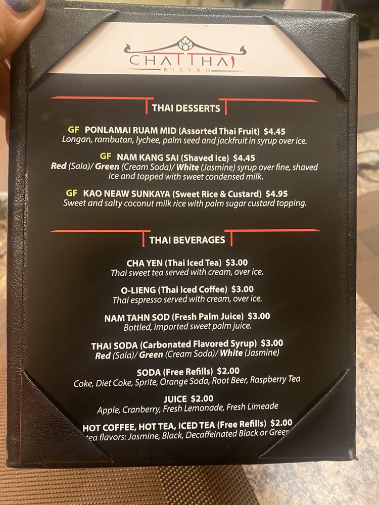 Introducing the menu at Chatthai Bistro, a gem in Pahrump, NV, offering fresh and flavorful Thai cuisine. With options for vegan and limited vegetarian diets, this cozy restaurant caters to all tastes. Customers rave about dishes like the Lemongrass Mojito, Waterfall Salad, Yellow Curry, Calamari Appetizer, Saki Shrimp with noodles, and Pad Thai with shrimp. Portion sizes are generous, ensuring satisfaction for all appetites. Despite being a one-person operation, the service is fast and attentive, with praise for servers like Lottie and Sharon. Don't miss the PadPek spicy catfish curry or the Sui Mai dumplings. Chatthai Bistro is a must-visit for delicious Thai fare in a casual and welcoming atmosphere.
