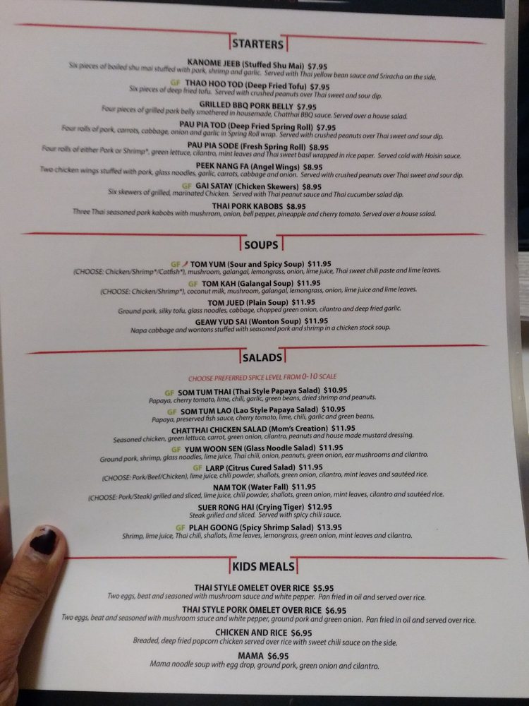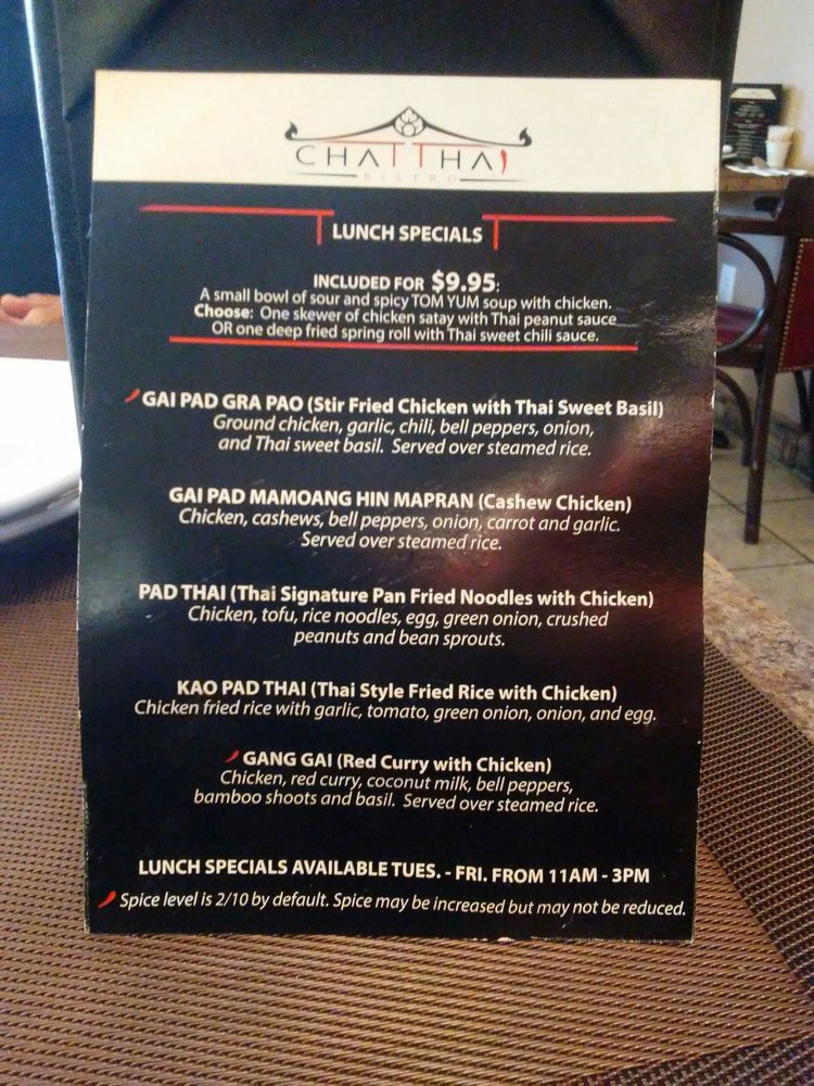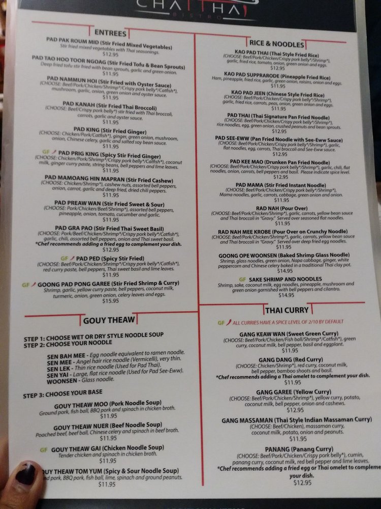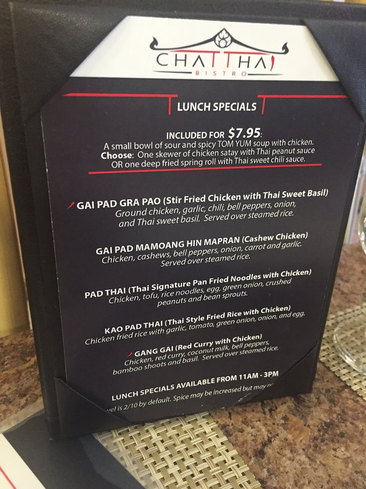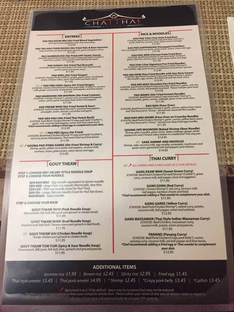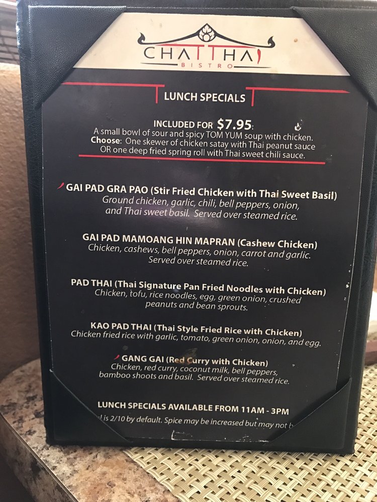 Introducing the menu at Chatthai Bistro, a gem in Pahrump, NV, offering fresh and flavorful Thai cuisine. With options for vegan and limited vegetarian diets, this cozy restaurant caters to all tastes. Customers rave about dishes like the Lemongrass Mojito, Waterfall Salad, Yellow Curry, Calamari Appetizer, Saki Shrimp with noodles, and Pad Thai with shrimp. Portion sizes are generous, ensuring satisfaction for all appetites. Despite being a one-person operation, the service is fast and attentive, with praise for servers like Lottie and Sharon. Don't miss the PadPek spicy catfish curry or the Sui Mai dumplings. Chatthai Bistro is a must-visit for delicious Thai fare in a casual and welcoming atmosphere.